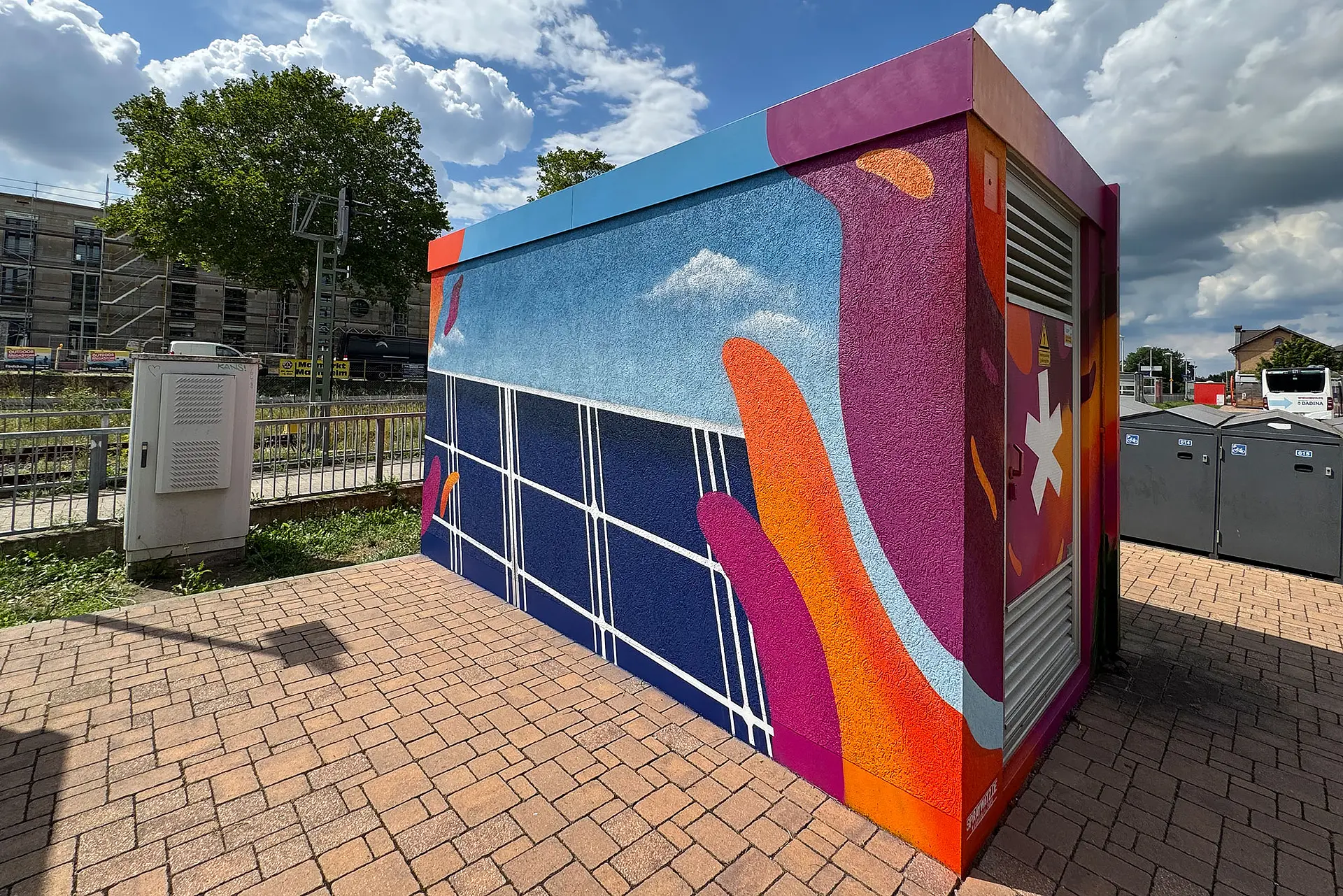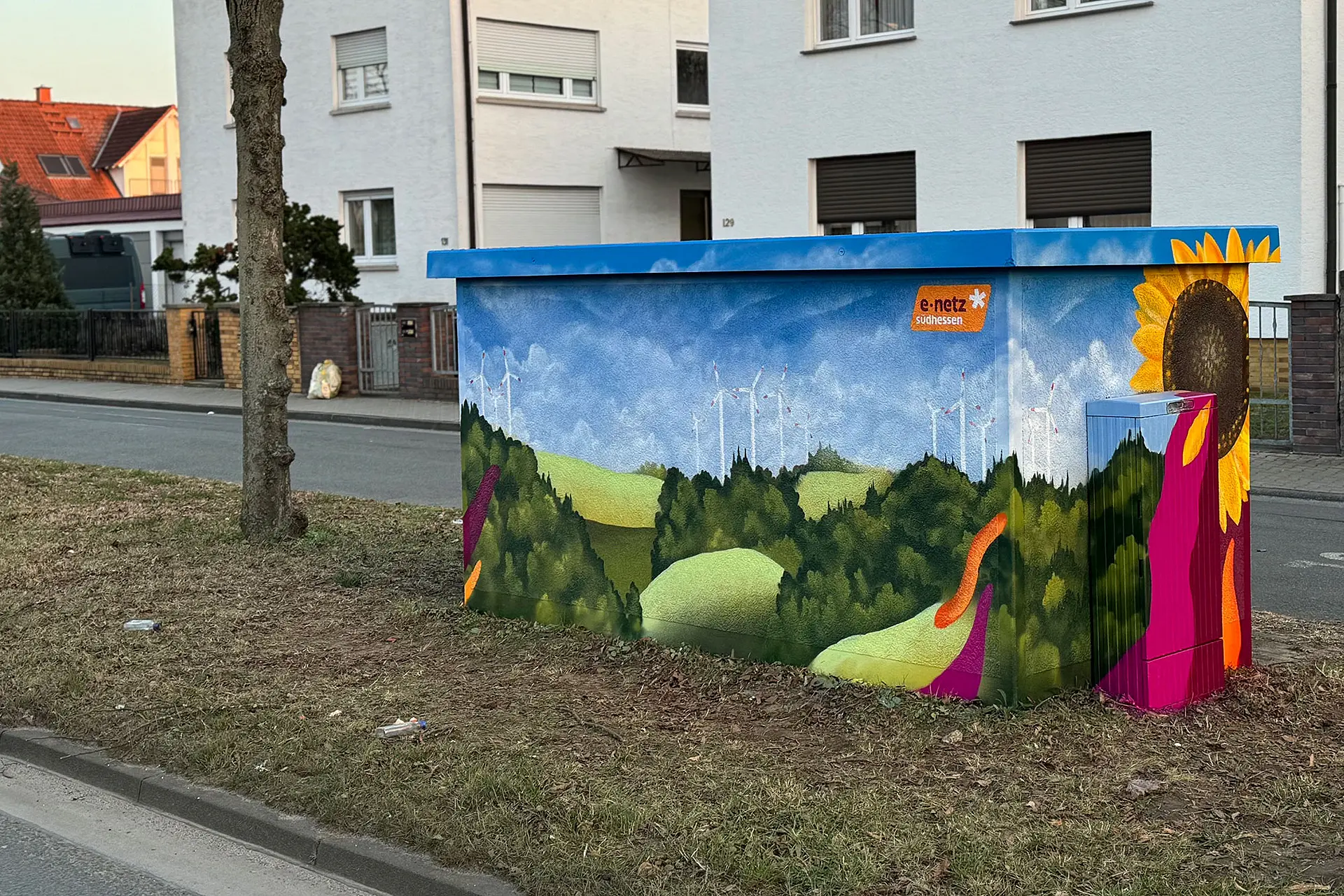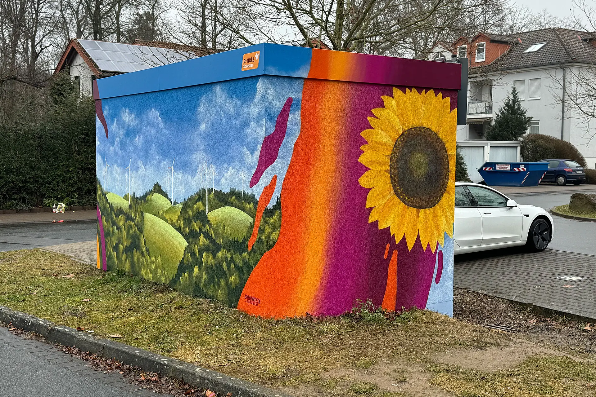 Dass Street Art längst eine etablierte Kunstform ist, beweisen auch die Motive auf den Trafostationen. Detailgetreu zeigen sie Landschaften, Blüten, aber auch Windräder und PV-Anlagen und stellen somit einen direkten Bezug zu unserem Unternehmen her.